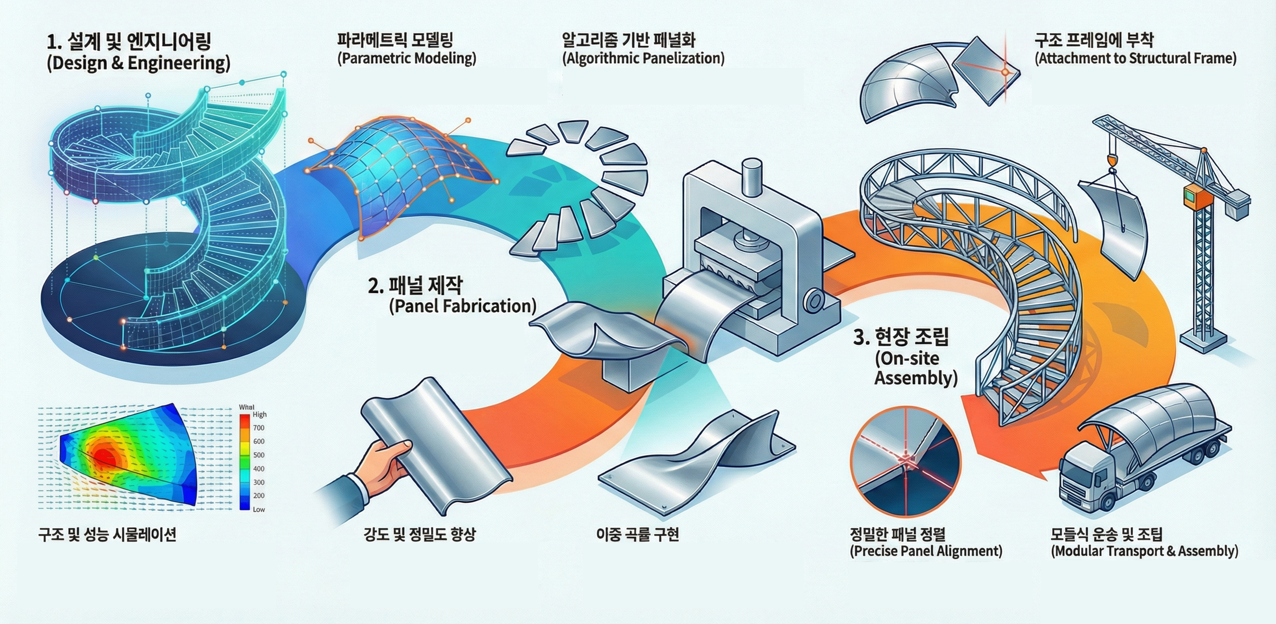 이 프로젝트의 핵심은 설계 데이터가 제작 장비로 직접 전달되는 디지털 스레드의 구축에 있었다고 합니다. Rhino와 Grasshopper를 통한 알고리즘 설계로 297개 패널의 각기 다른 곡률을 정의하고, 이를 별도의 종이 도면 없이 제작소로 직접 전송하는 'File-to-Factory' 워크플로우를 완성했습니다. 이는 비정형 건축을 다룰 때 가장 중요한 '설계 합리화(Rationalization)'의 성공적인 사례로 평가받습니다.