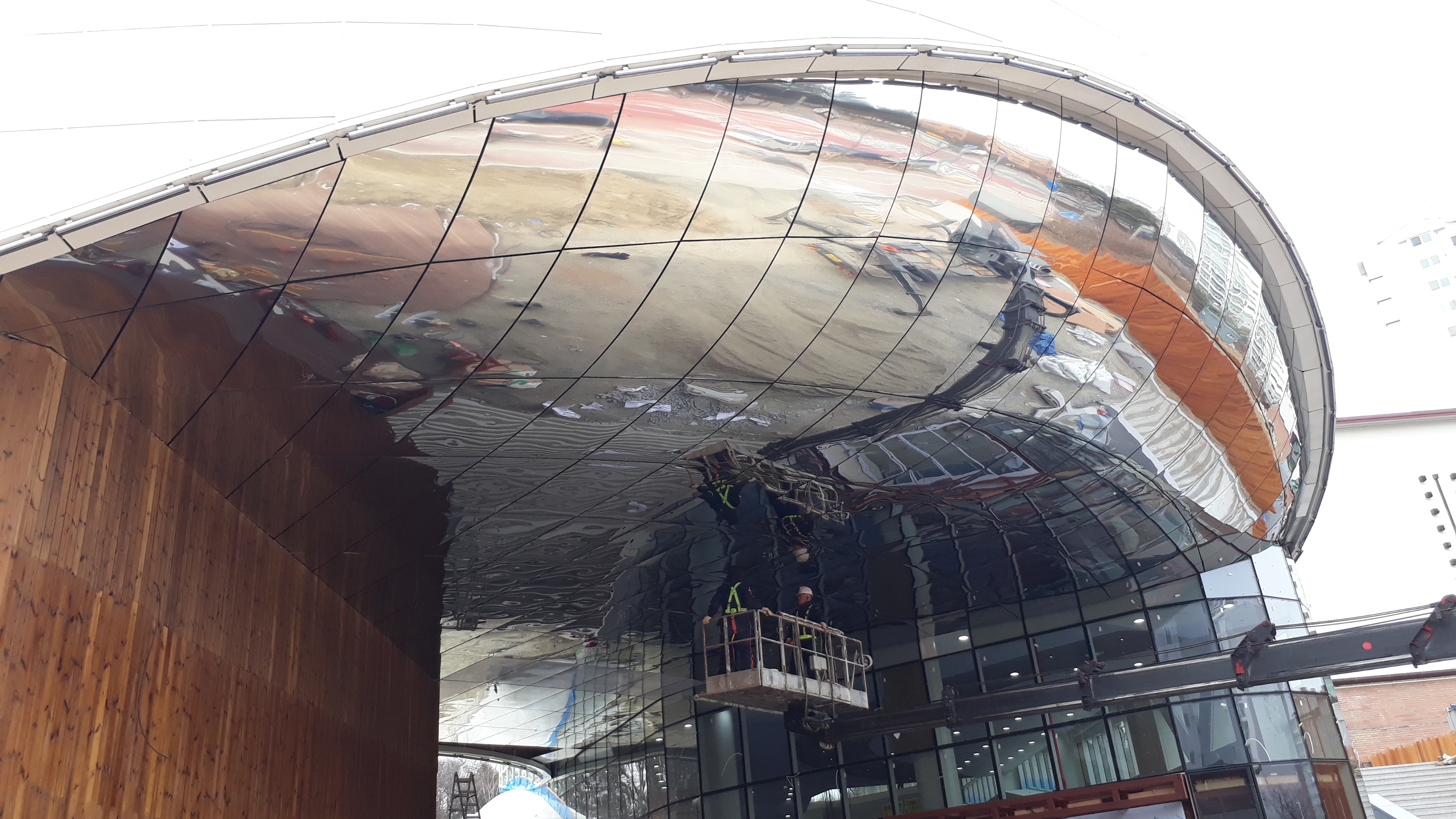 제작을 담당한 CIG Architecture는 선박의 동체를 만드는 조선 공학 노하우를 건축에 이식하였다고 합니다. 열 변형 없이 금속판을 구부리는 3D Cold Forming 기술을 통해 스테인리스 스틸 본연의 성질과 광학적 평탄도를 유지할 수 있었습니다.